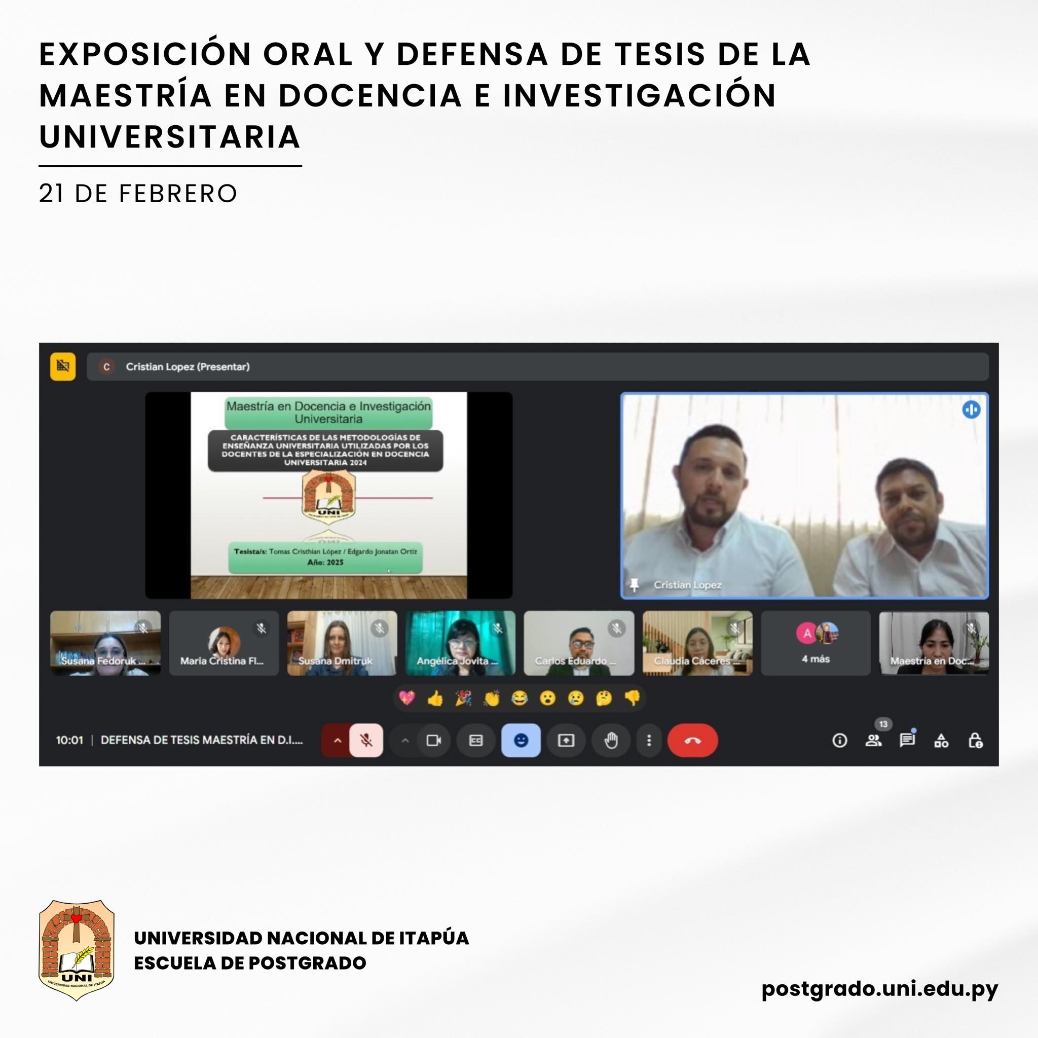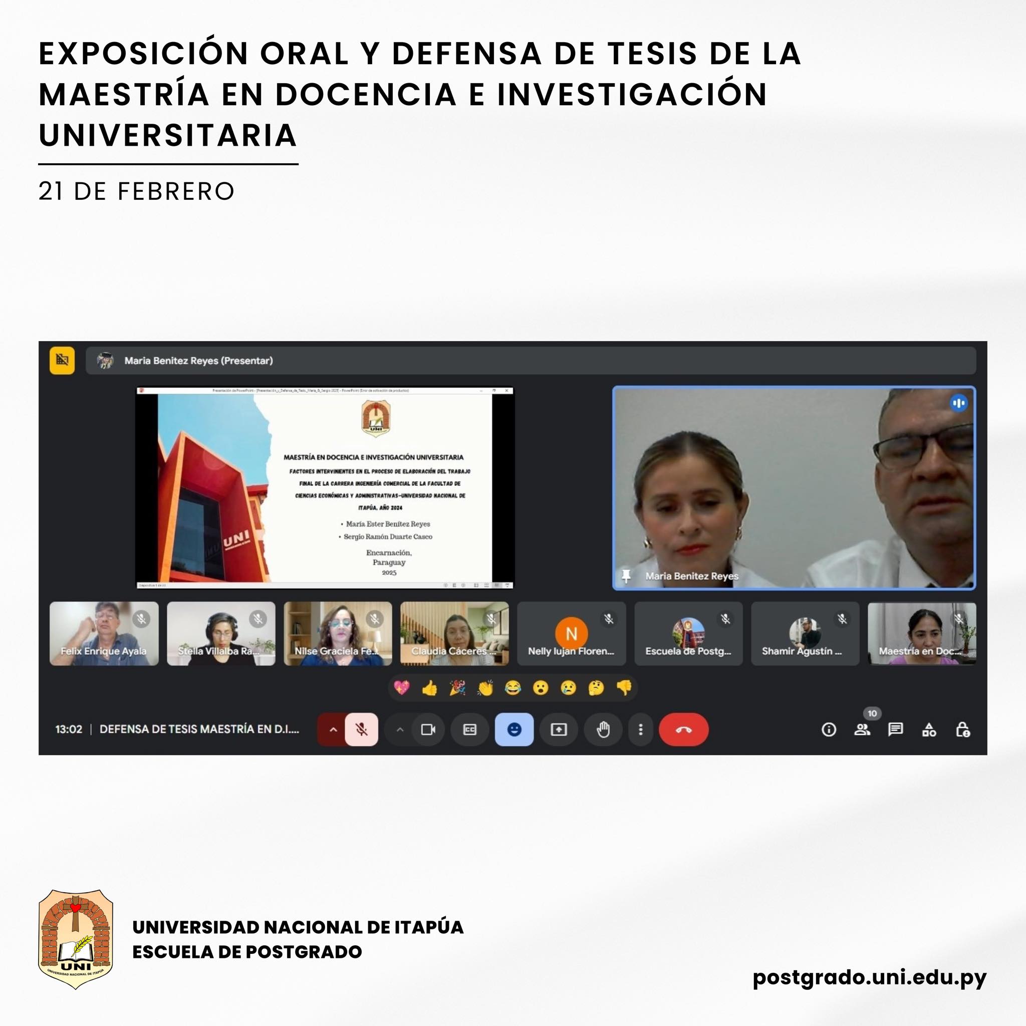 En la Escuela de Postgrado de la Universidad Nacional de Itapúa (UNI) se desarrolló la Defensa de Tesis del Programa Maestría en Docencia e Investigación Universitaria, el día viernes 21 de febrero.