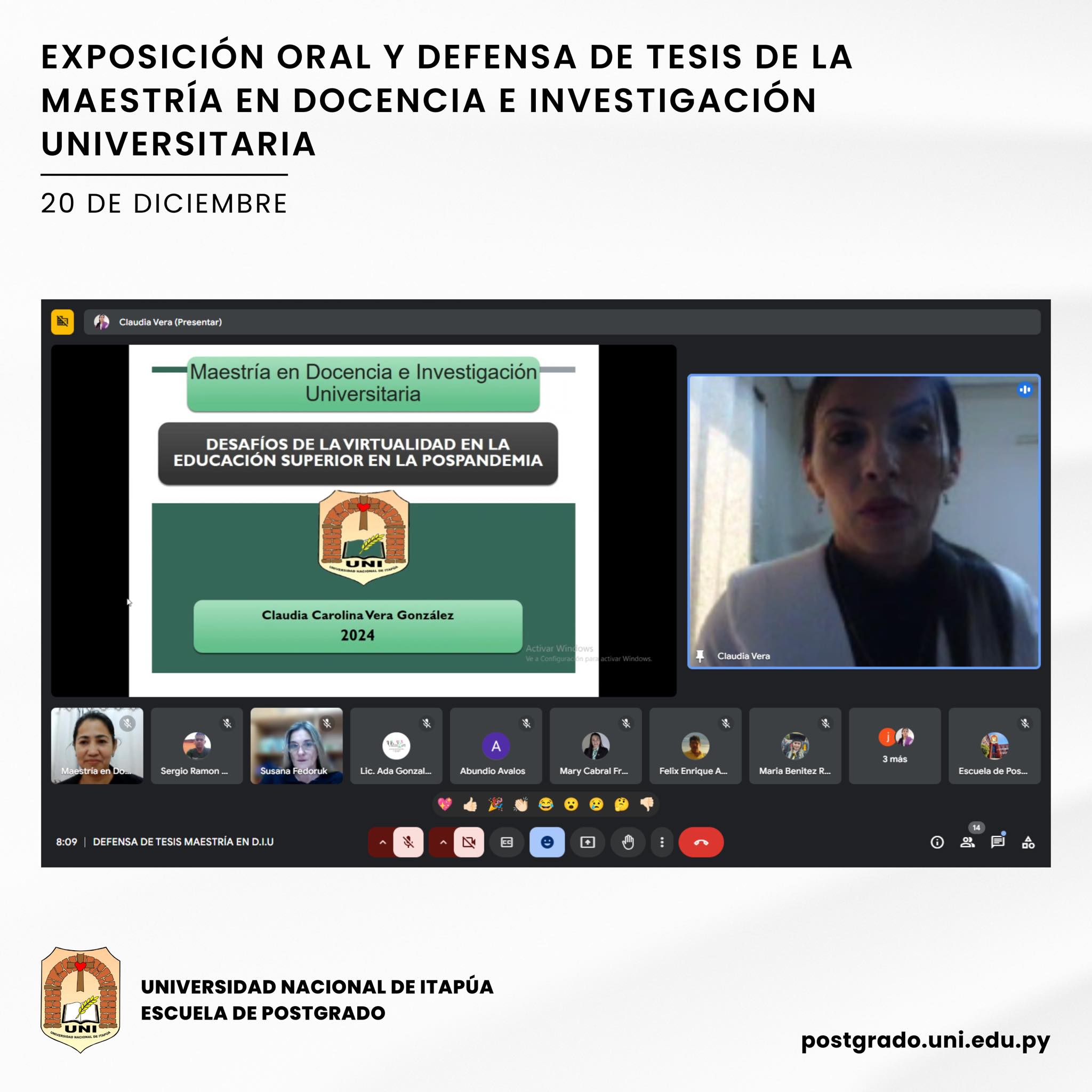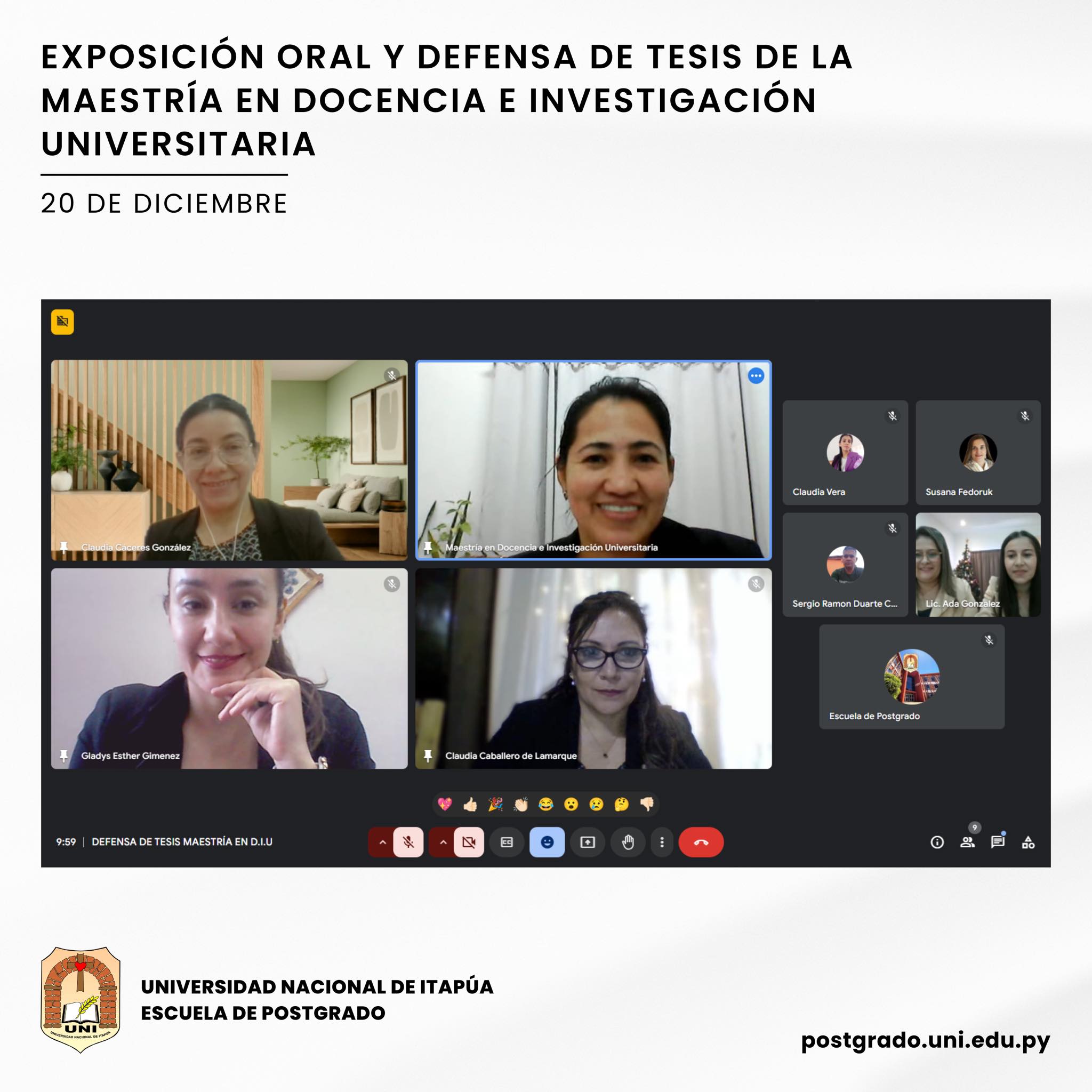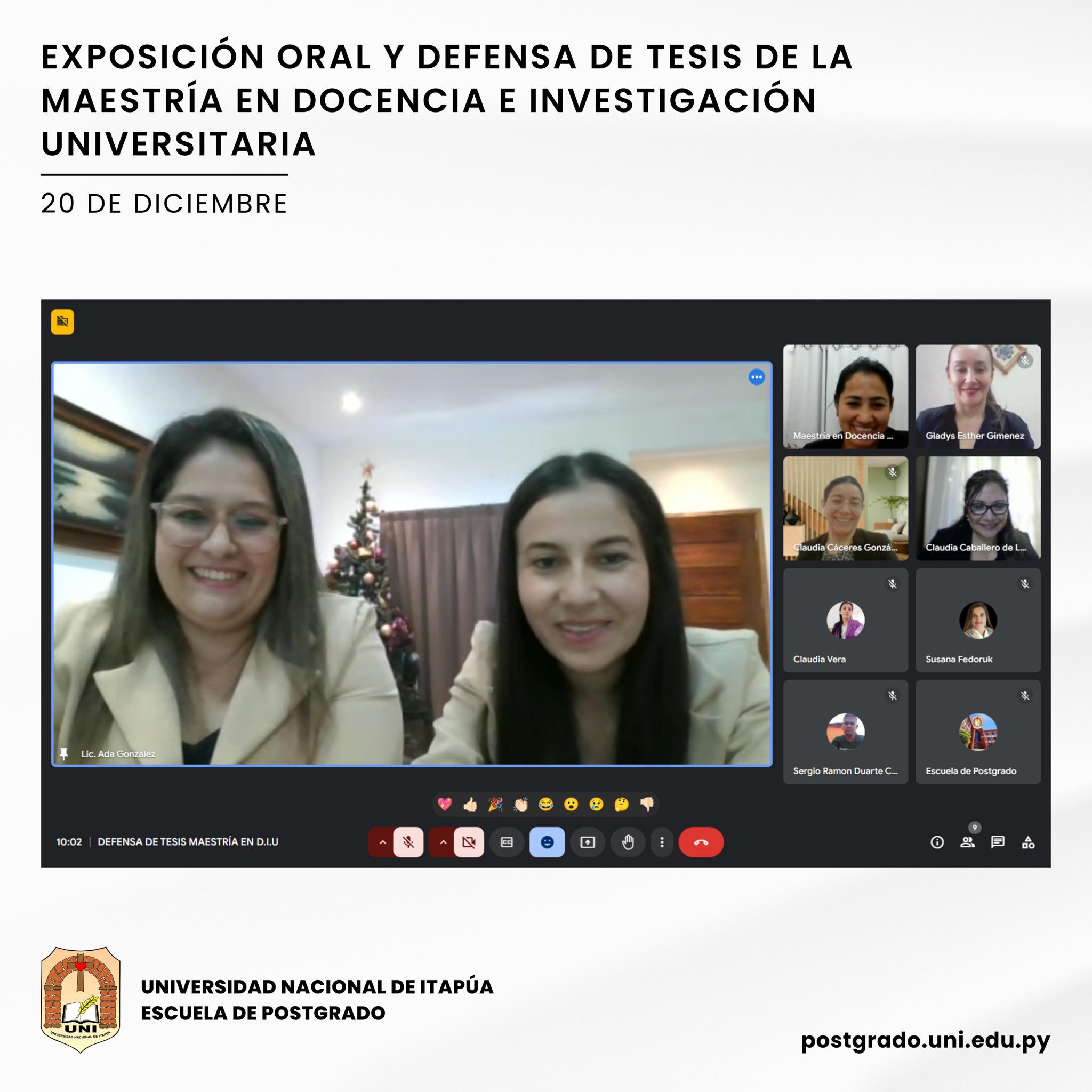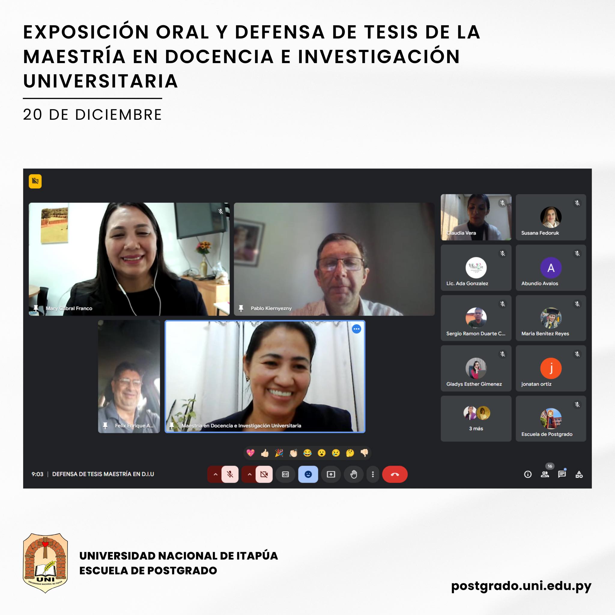 En la Escuela de Postgrado de la Universidad Nacional de Itapúa (UNI) se desarrolló la Defensa de Tesis del Programa Maestría en Docencia e Investigación Universitaria, el día viernes 20 de diciembre.