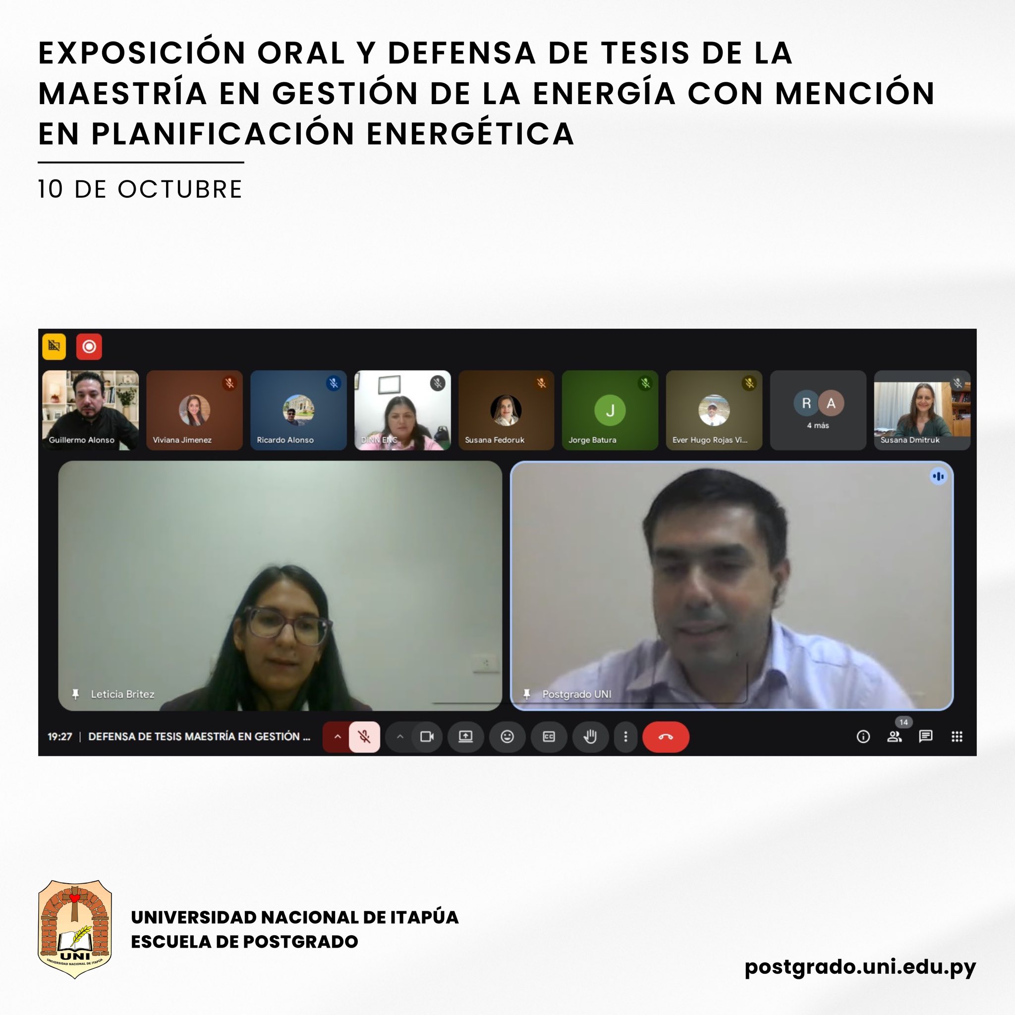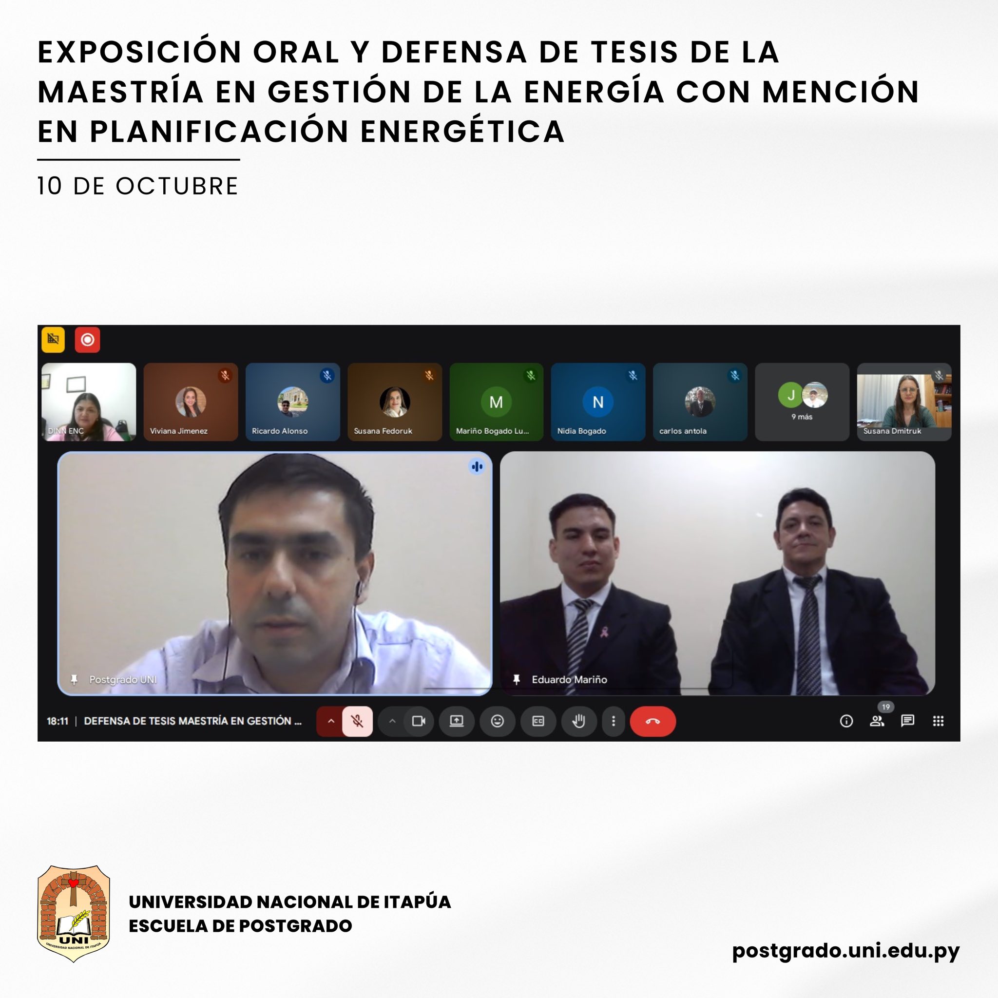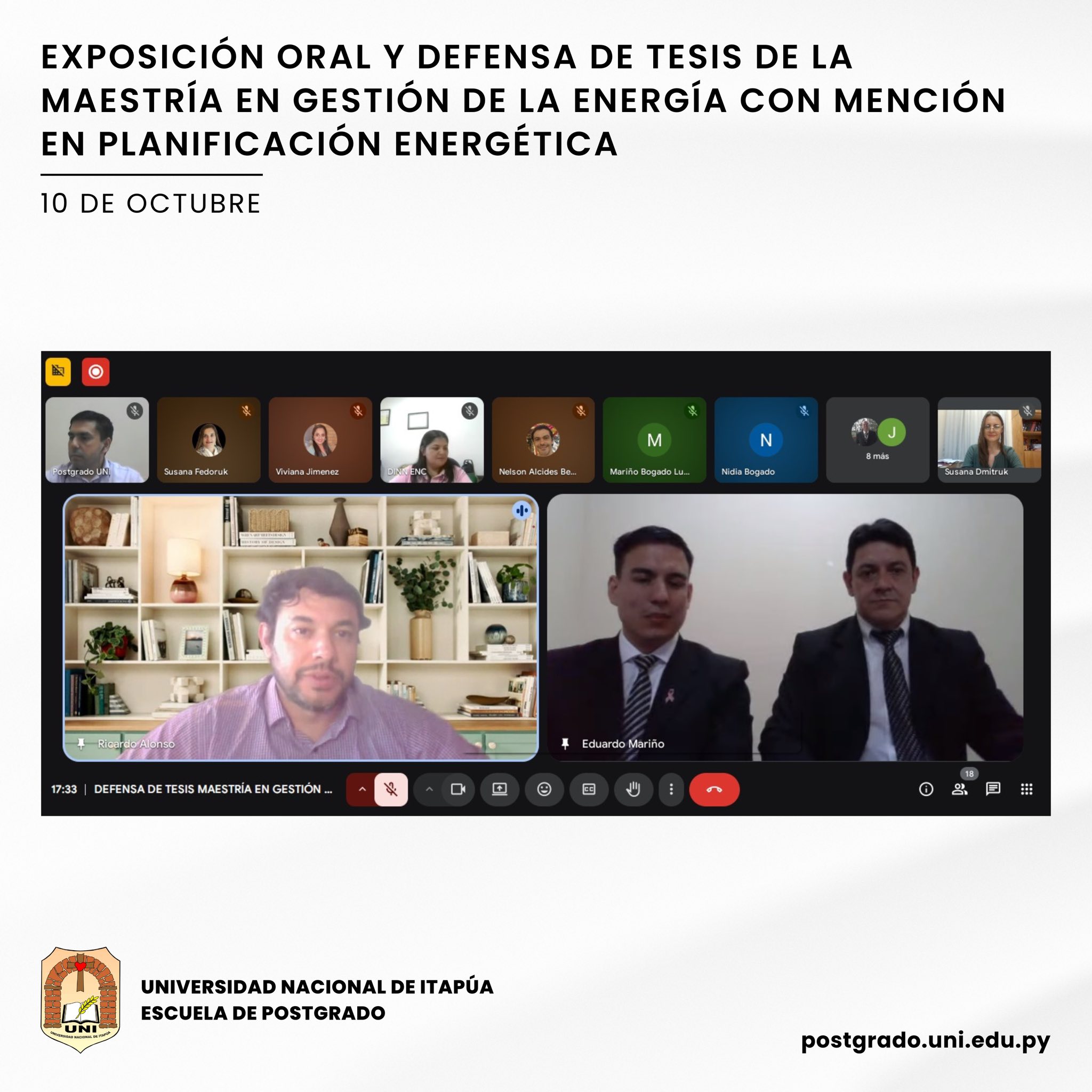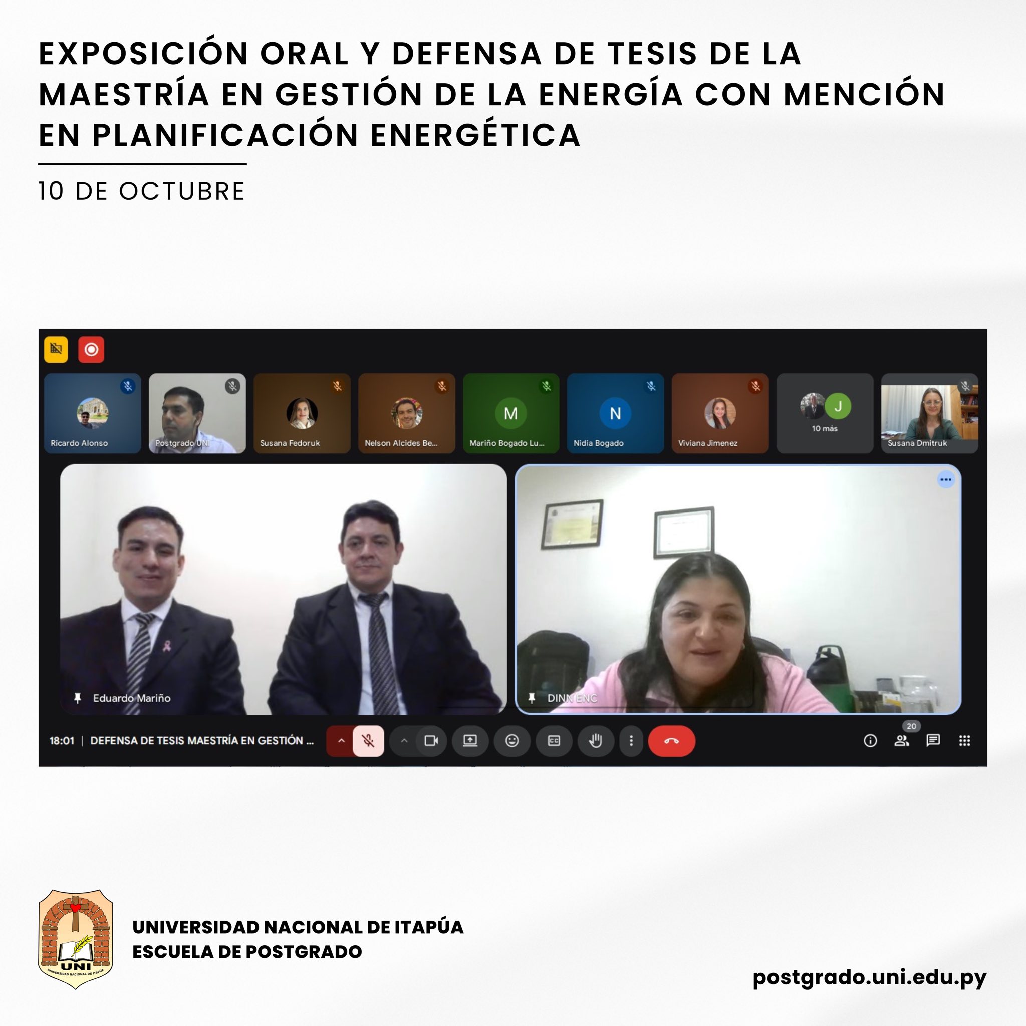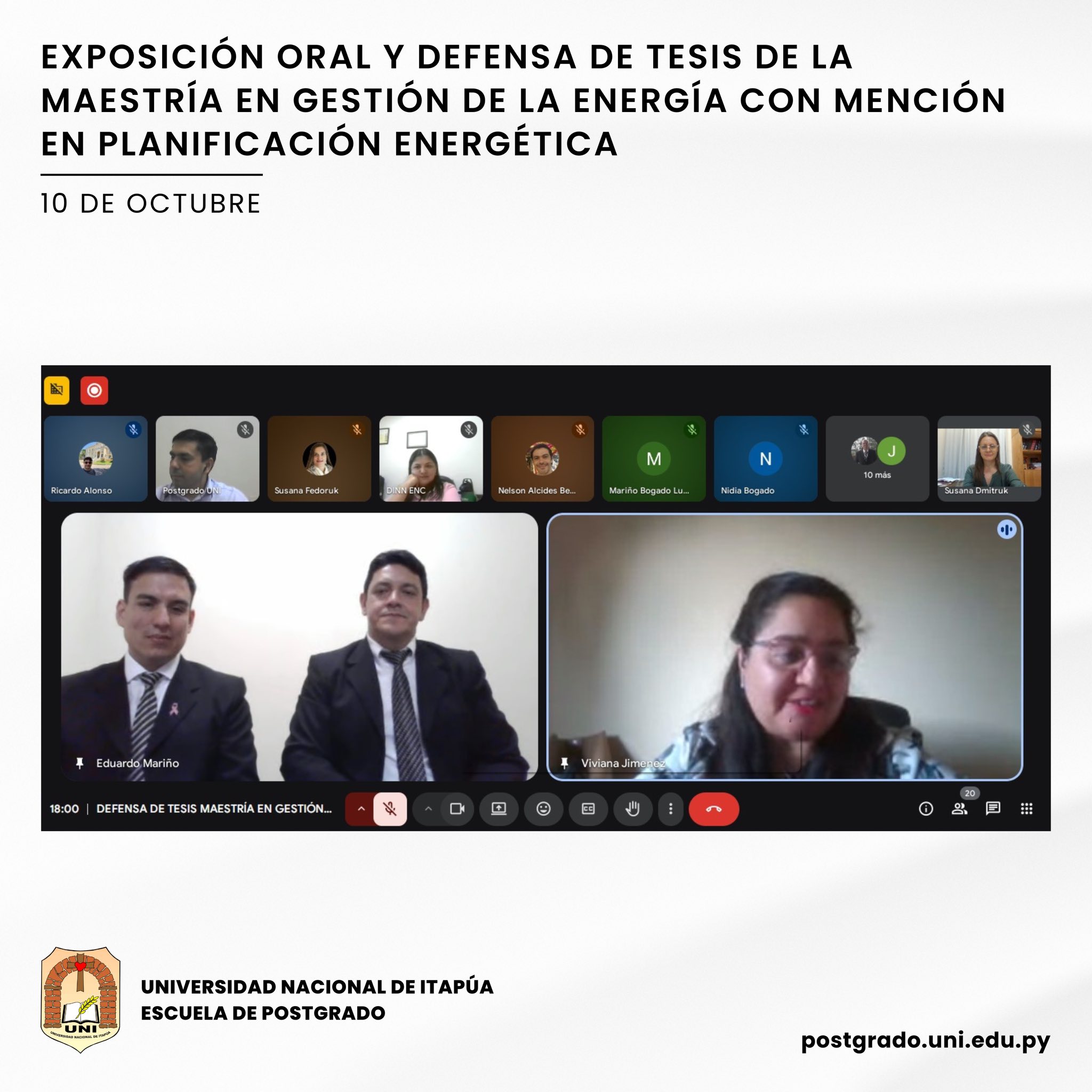 En la Escuela de Postgrado de la Universidad Nacional de Itapúa (UNI) se desarrolló la Defensa de Tesis del Programa Maestría en Gestión de la Energía con Mención en Planificación Energética, el día viernes 10 de octubre.