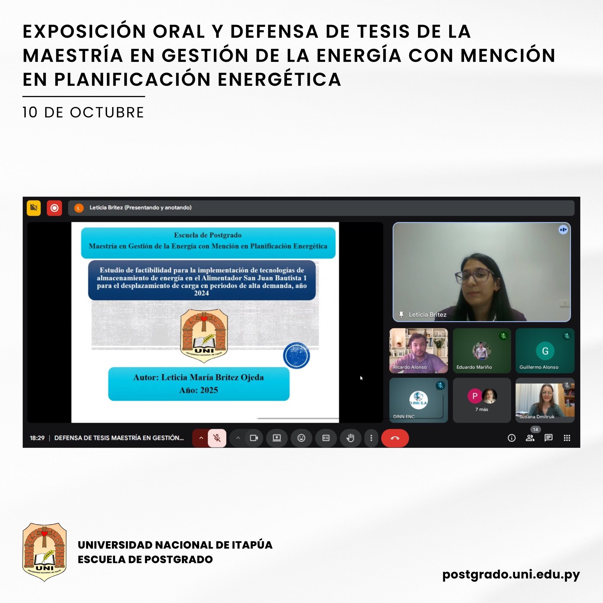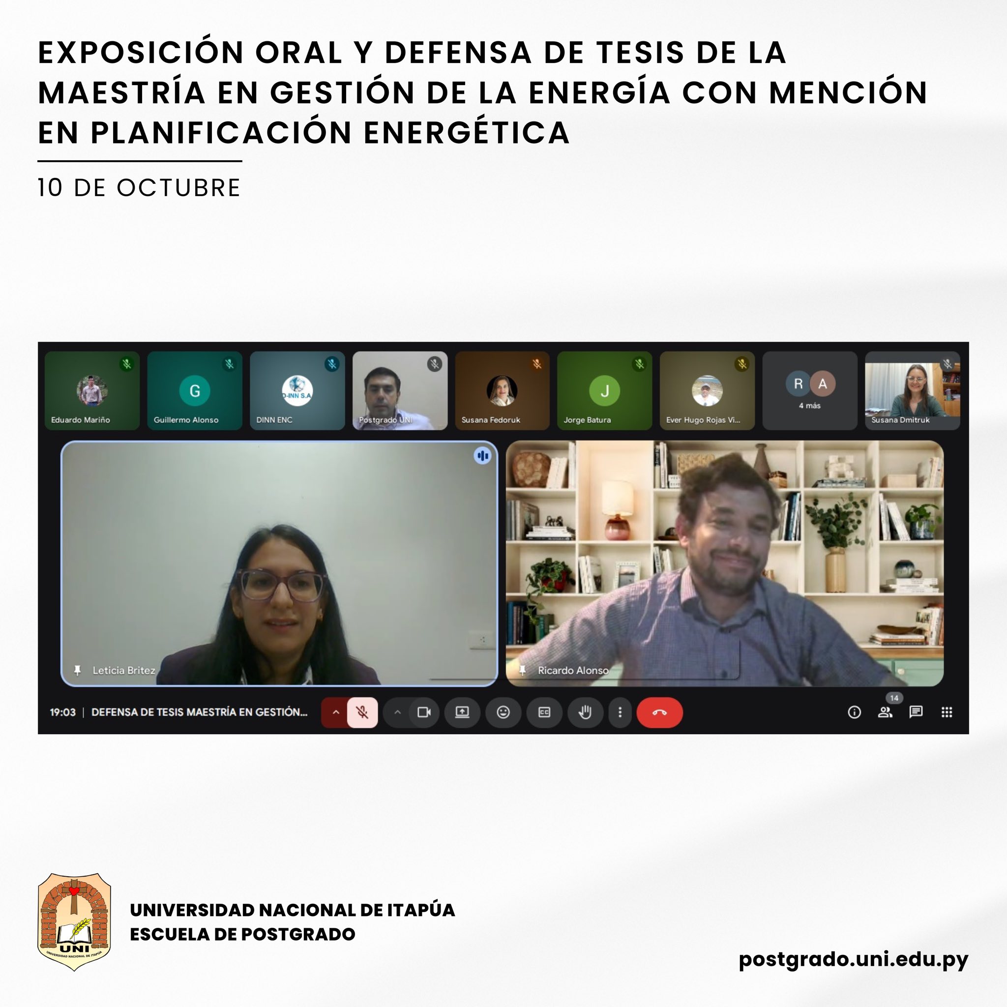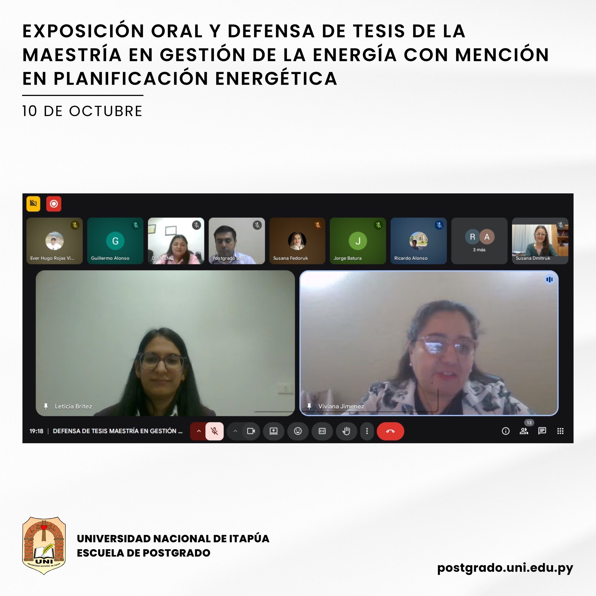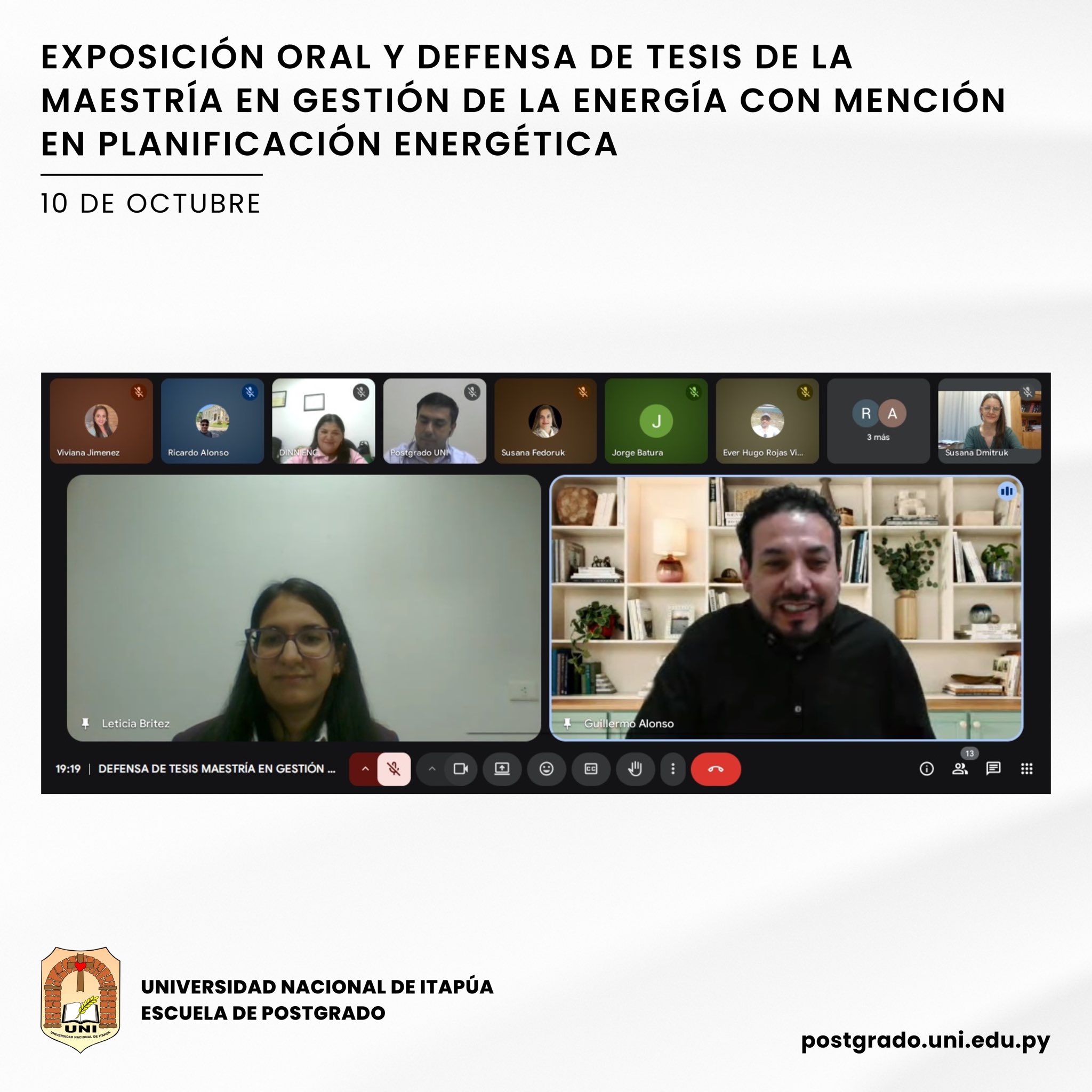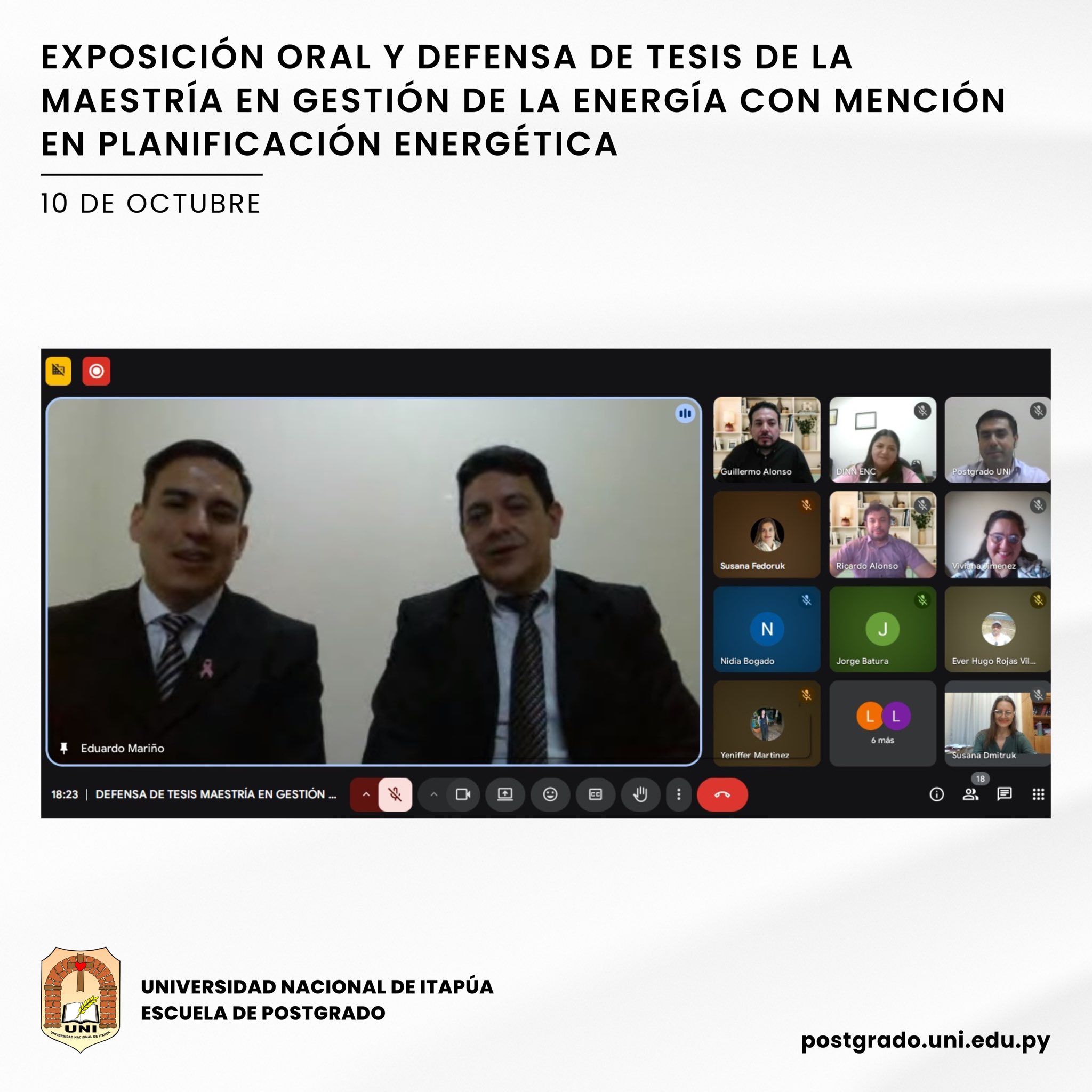 En la Escuela de Postgrado de la Universidad Nacional de Itapúa (UNI) se desarrolló la Defensa de Tesis del Programa Maestría en Gestión de la Energía con Mención en Planificación Energética, el día viernes 10 de octubre.