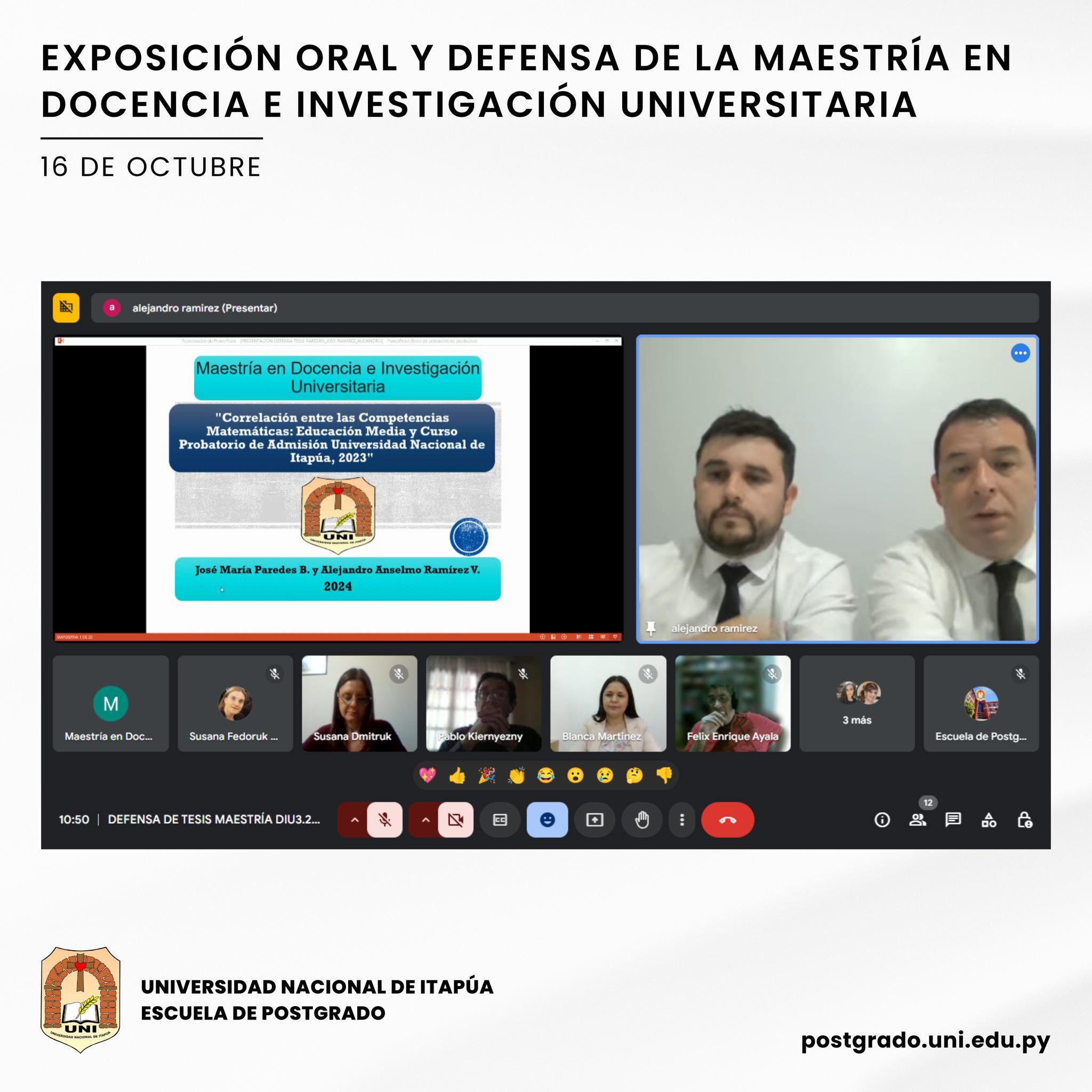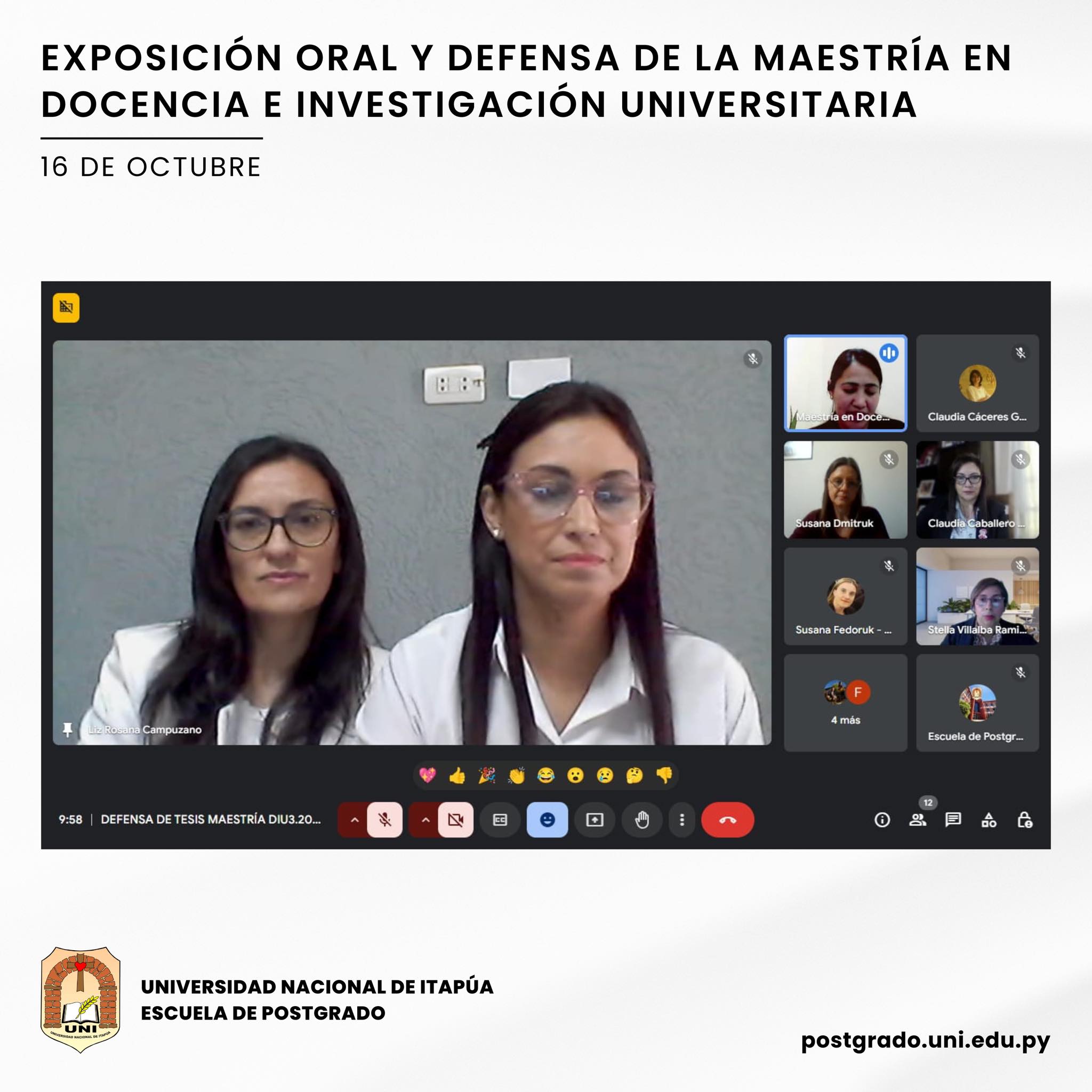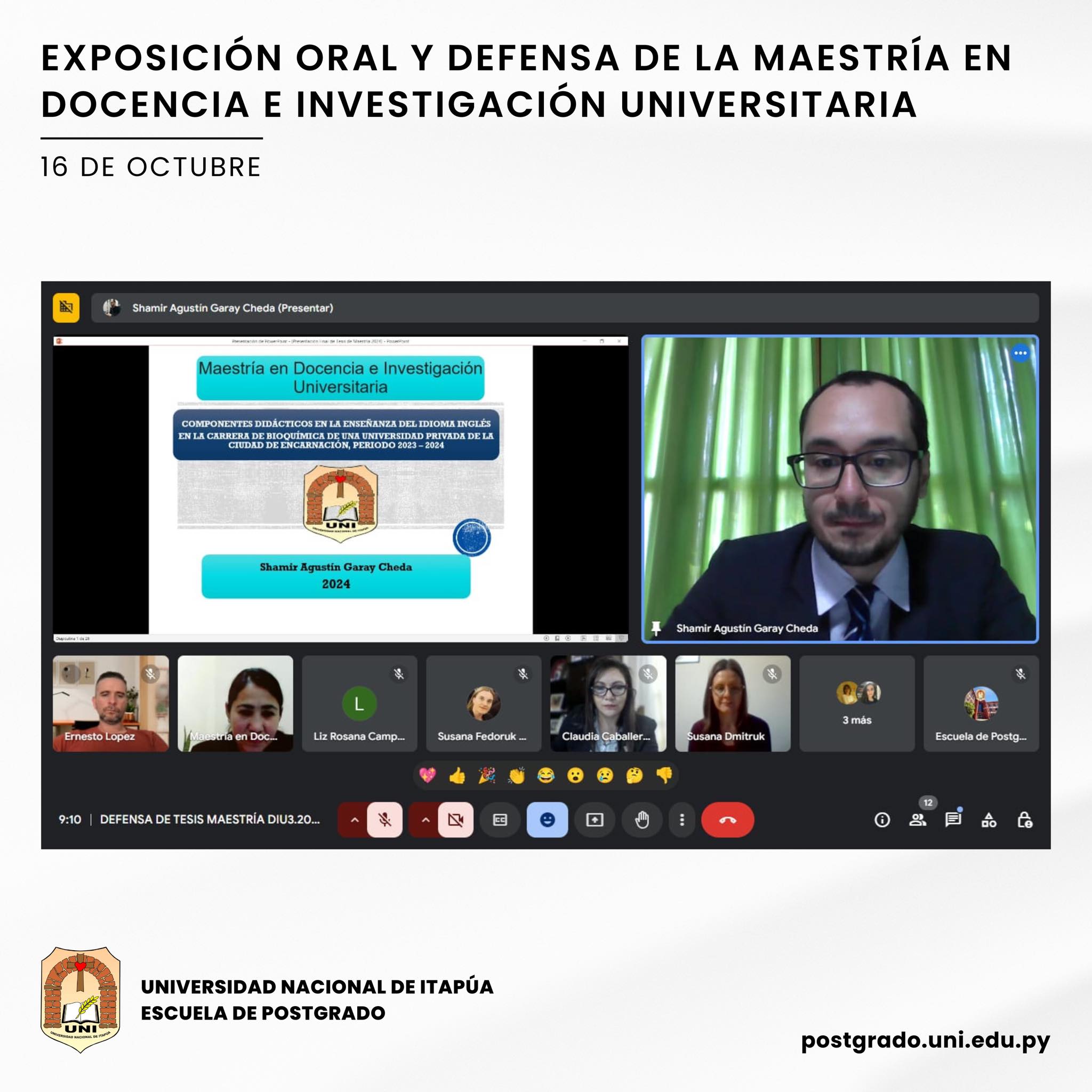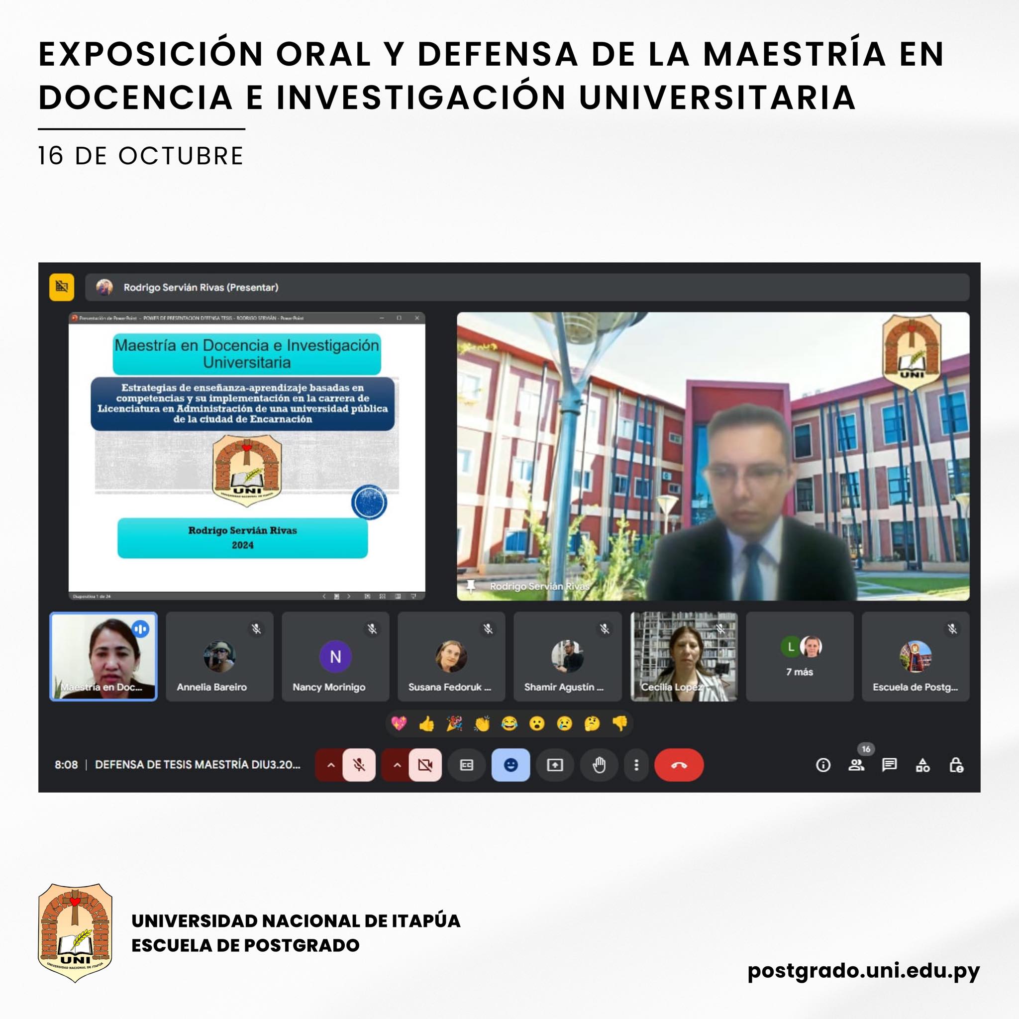 En la Escuela de Postgrado de la Universidad Nacional de Itapúa (UNI) se desarrolló la Defensa de Tesis del Programa Maestría en Docencia e Investigación Universitaria, el día miércoles 16 de octubre.