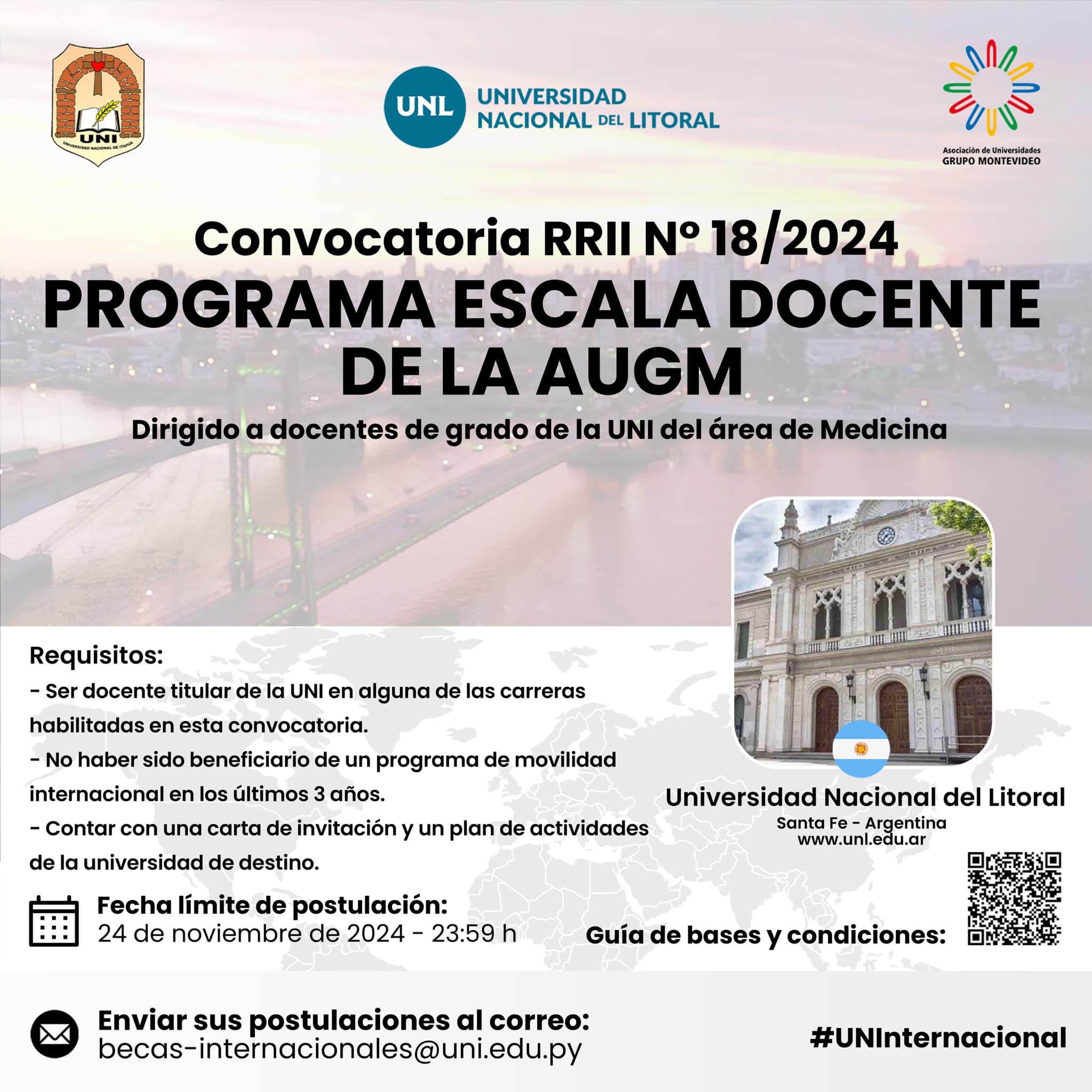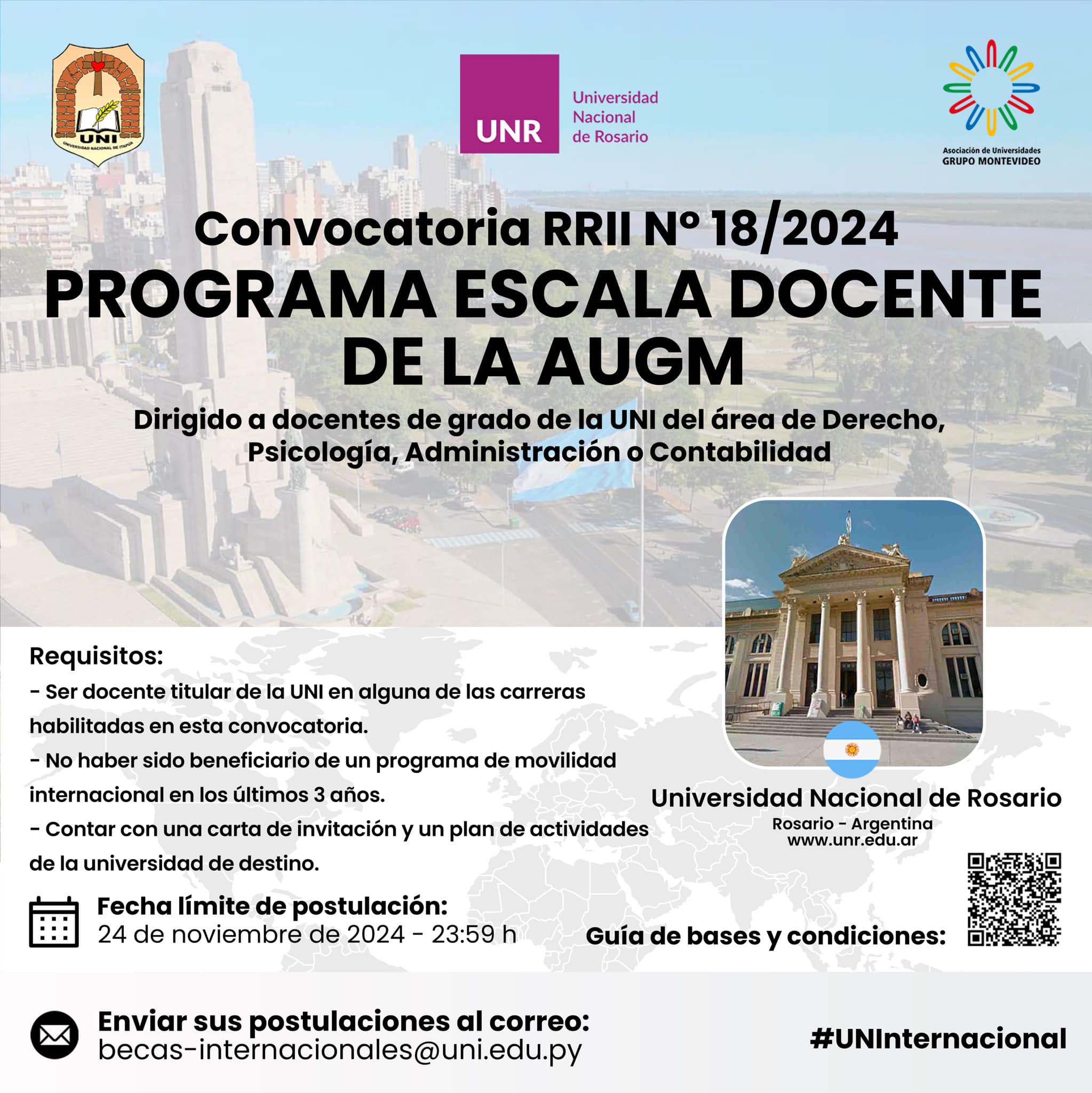 La Universidad Nacional de Itapúa, a través del Departamento de Relaciones Internacionales, convoca a becas para realizar movilidad internacional del personal académico de grado, a través del programa ESCALA DOCENTE de la Asociación de Universidades Grupo Montevideo. Este programa promueve la cooperación e integración regional de las Universidades miembro a través de la movilidad