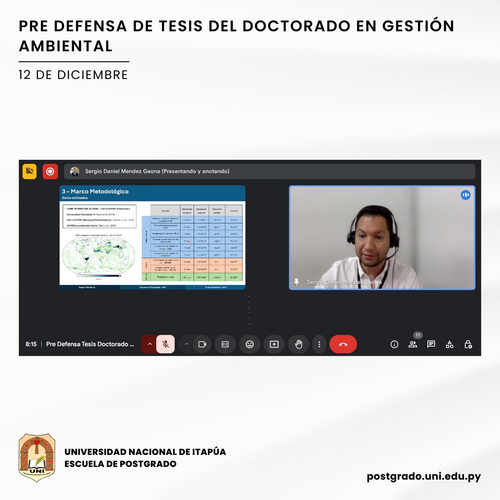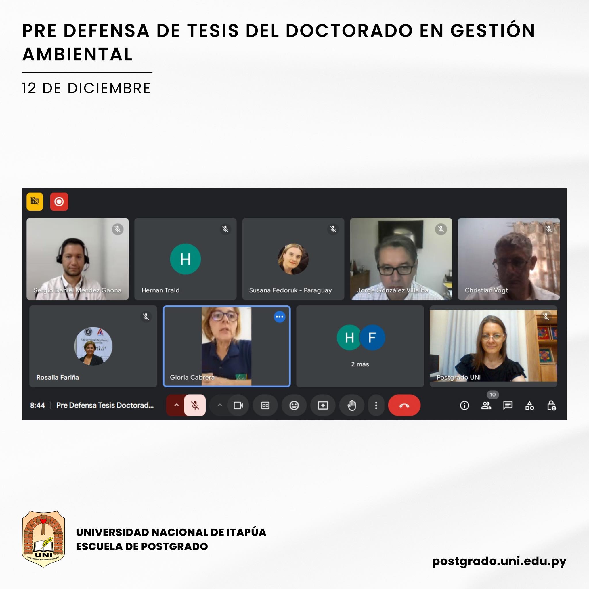 En la Escuela de Postgrado de la Universidad Nacional de Itapúa (UNI) se desarrolló la Pre Defensa de Tesis del Programa Doctorado en Gestión Ambiental, el día jueves 12 de diciembre.