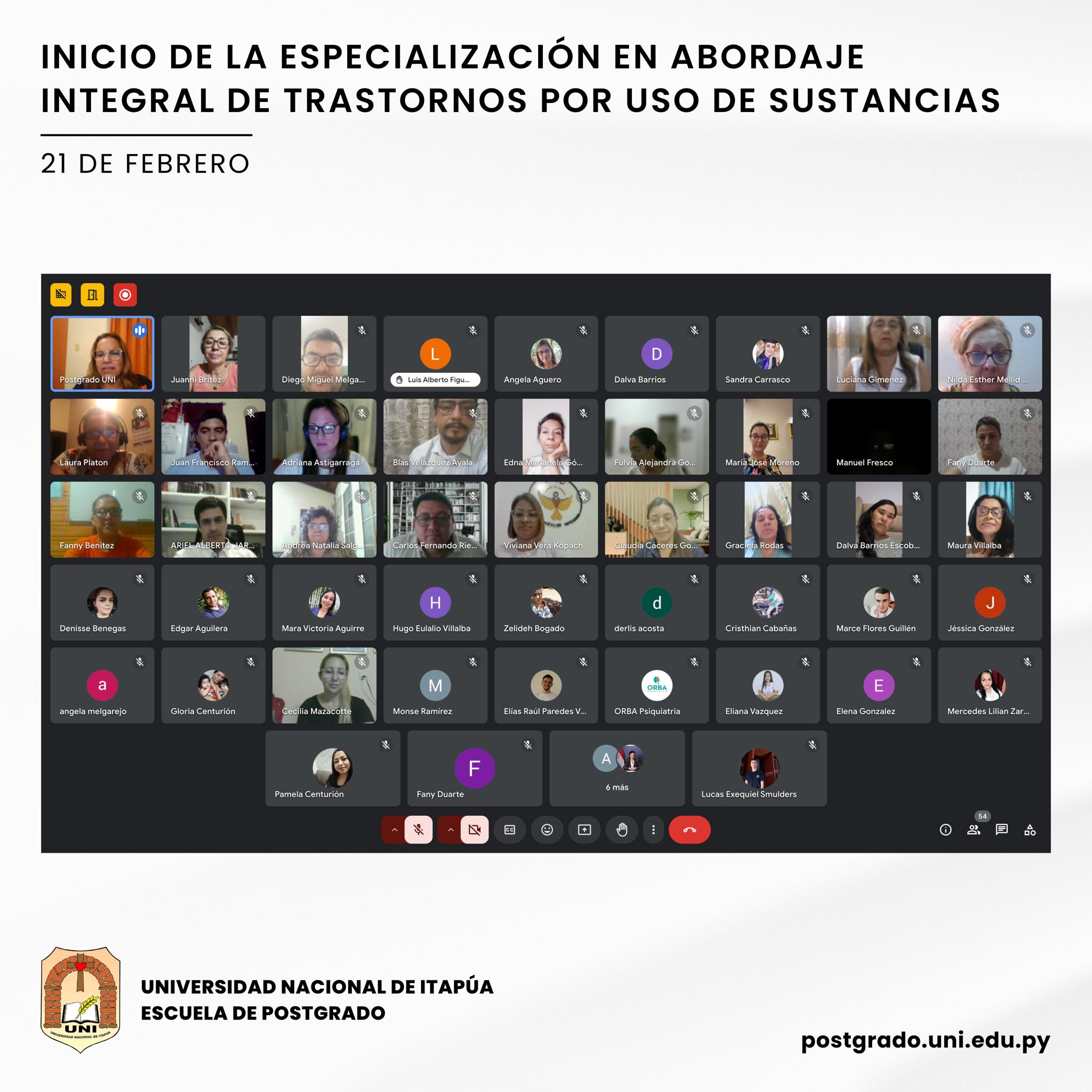 El día viernes, 21 de febrero inició con total éxito las clases del Programa de Especialización en Abordaje Integral de Trastornos por Uso de Sustancias. En la oportunidad la Dra. Susana Fedoruk Haiñ, Directora de la Escuela de Postgrado dio la apertura y bienvenida a los participantes del referido curso.