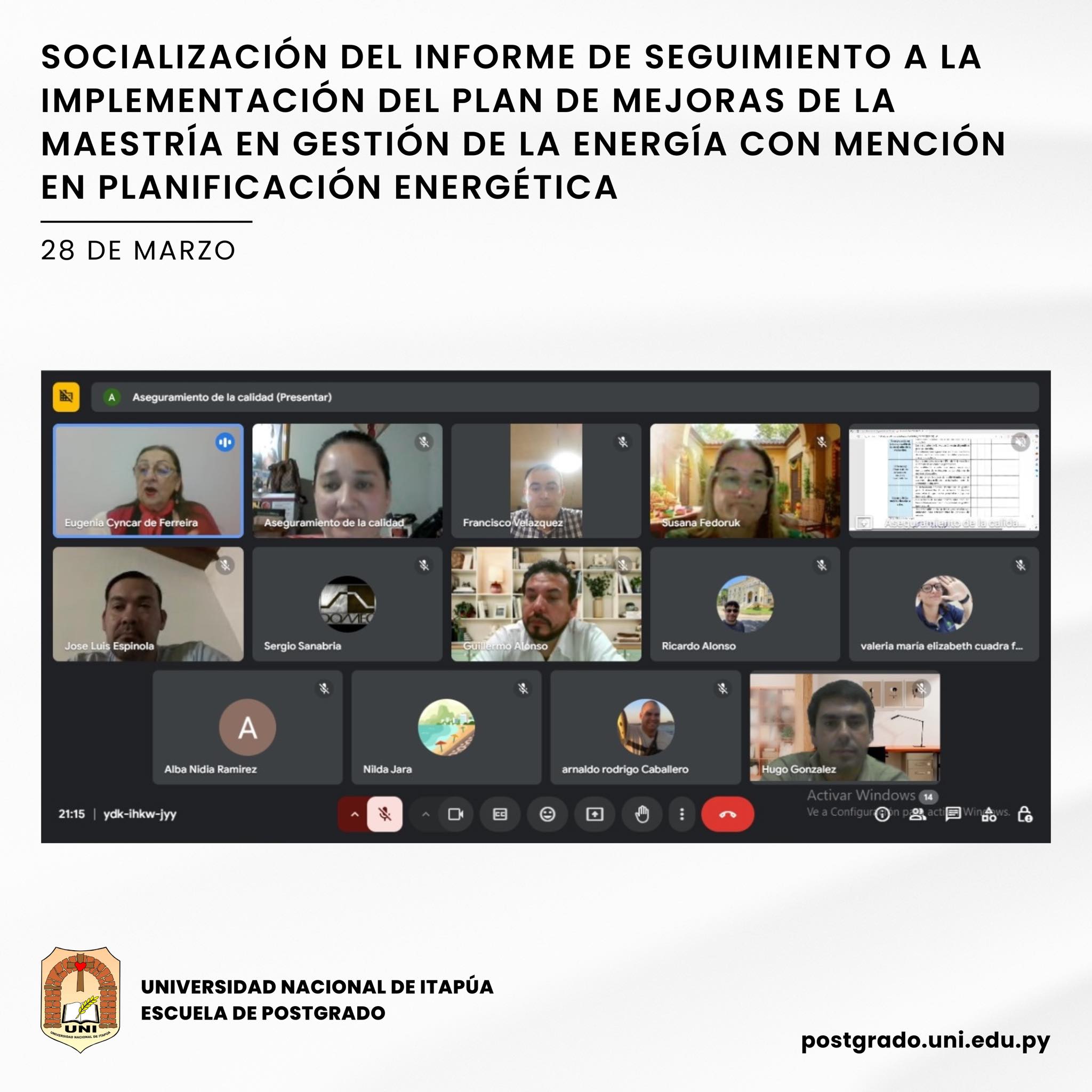 Socialización del “Informe de Seguimiento a la Implementación del Plan de Mejoras del Programa de Maestría en Gestión de la Energía con mención en Planificación Energética de la Escuela de Postgrado de la Universidad Nacional de Itapúa”