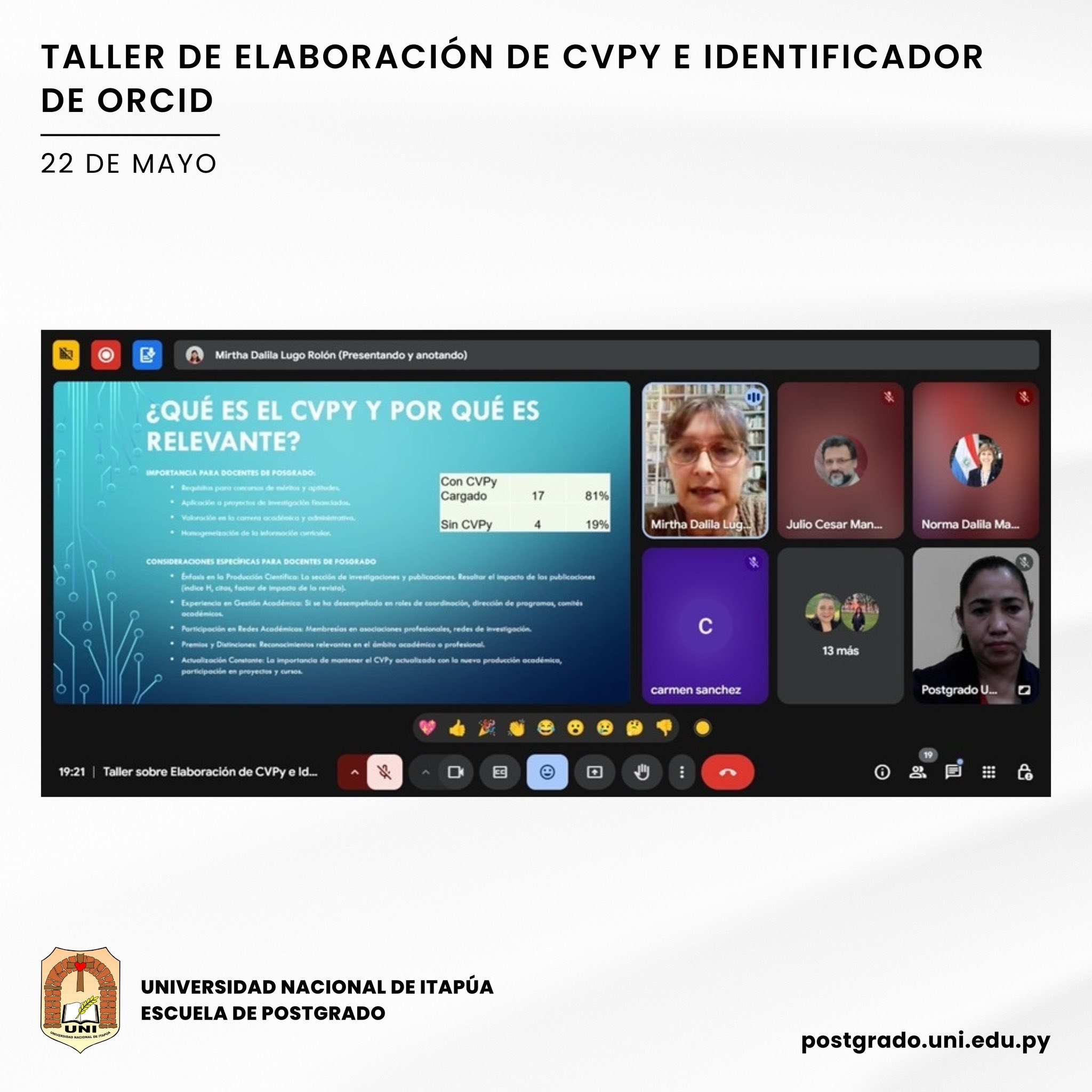 Desde la Escuela de Postgrado de la Universidad Nacional de Itapúa, en fecha 22 de mayo, se ha desarrollado el primer encuentro del Taller sobre carga en el software de CVPy e Identificador de ORCID, el mismo estuvo dirigido a docentes y personal de apoyo de los distintos Programas de la Escuela de Postgrado.